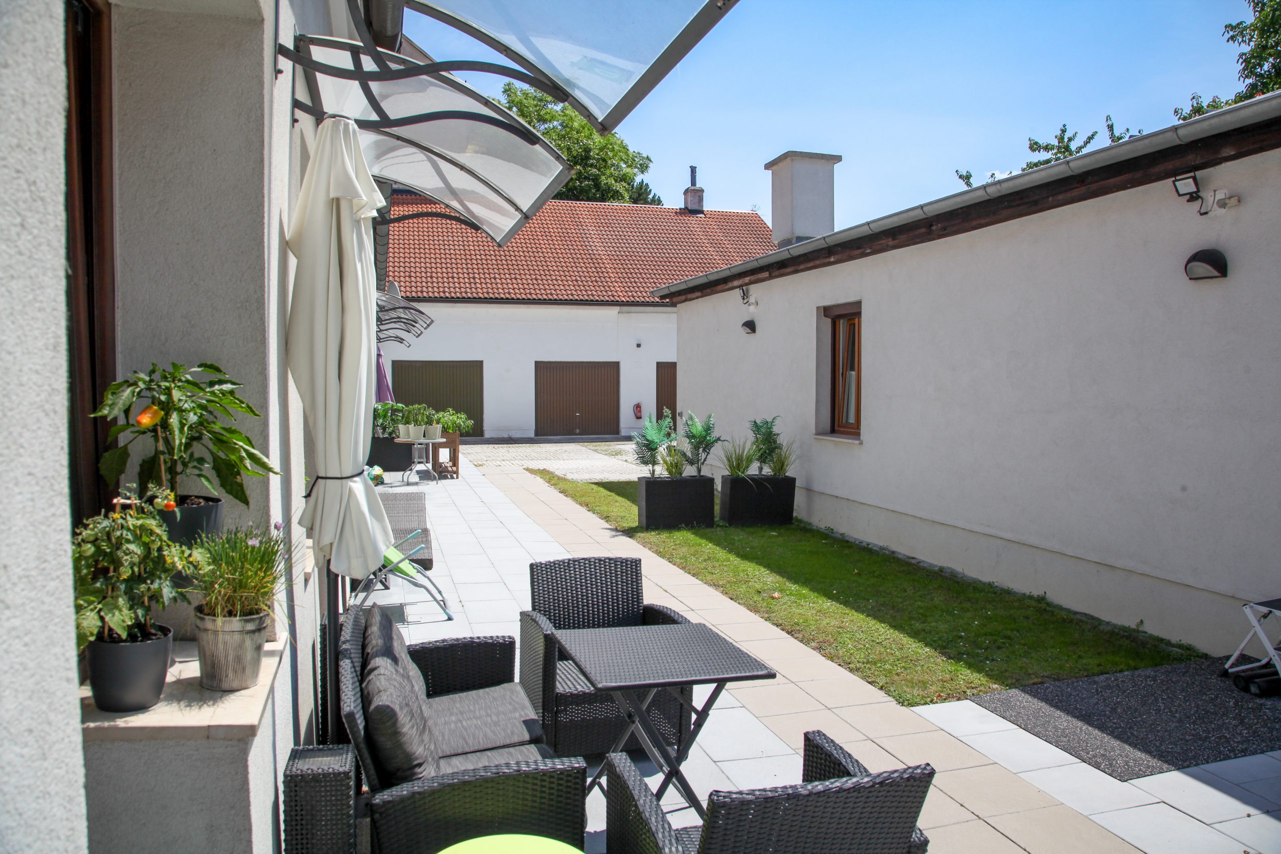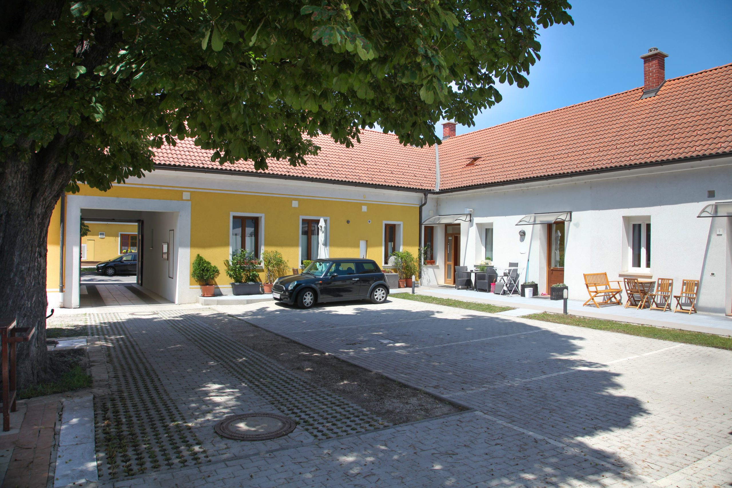 Jede Wohnung verfügt über eine private Terrasse – Ihr ganz persönlicher Rückzugsort ins Grüne. Der liebevoll gestaltete Innenhof mit einem großen, schattenspendenden Kastanienbaum lädt zum Verweilen und Kennenlernen ein. Hier entsteht eine kleine, feine Gemeinschaft – ideal für Menschen, die in Ruhe leben, aber nicht alleine wohnen möchten.